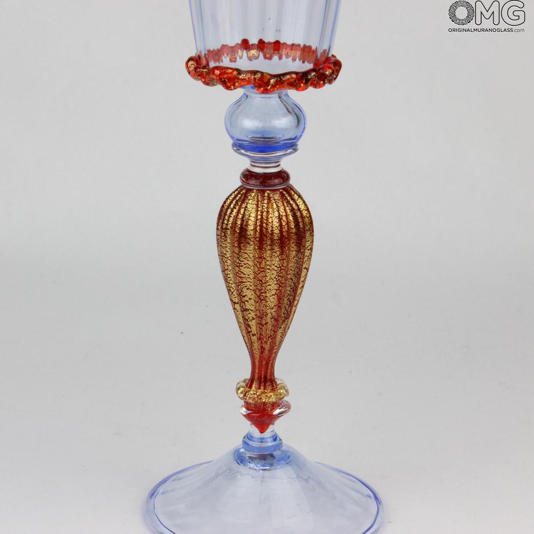 Calice di tipo tipetto muranese in vetro soffiato con decoro in oro, realizzato in cristallo rosso e acquamare. Tutte le parti sono lavorate a caldo.