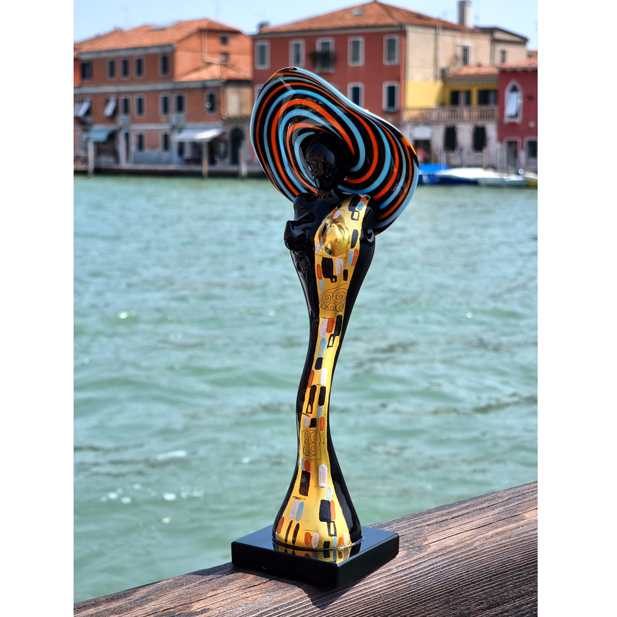 Tributo a Klimt. Scultura molto alla moda, figurina femminile elegante, fatta con la tecnica del vetro a lume con corpo soffiato, cappello in filigrana, dipinto con 24 kt oro. Il pezzo è unico, ed è realizzato dai Maestri Vetrai Studio DaMula.