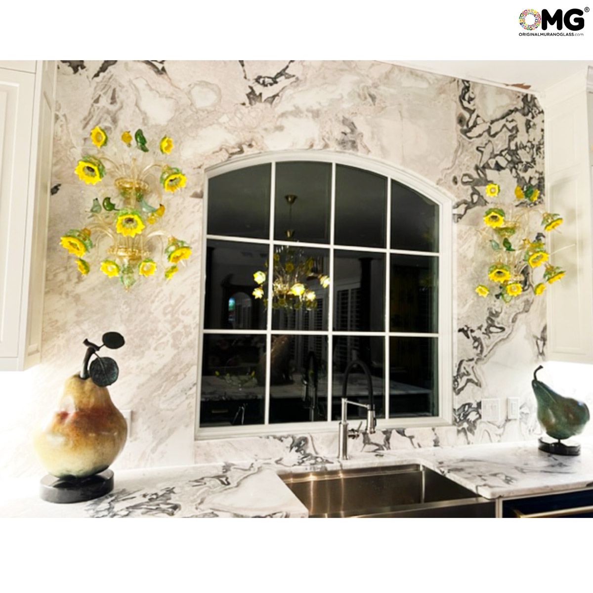 Applique veneziano in vetro trasparente veneziano con graziosi girasoli lavorati a mano con dettagli in vetro verde e oro 24 carati. L'opera ha piccoli passeri sulle foglie.