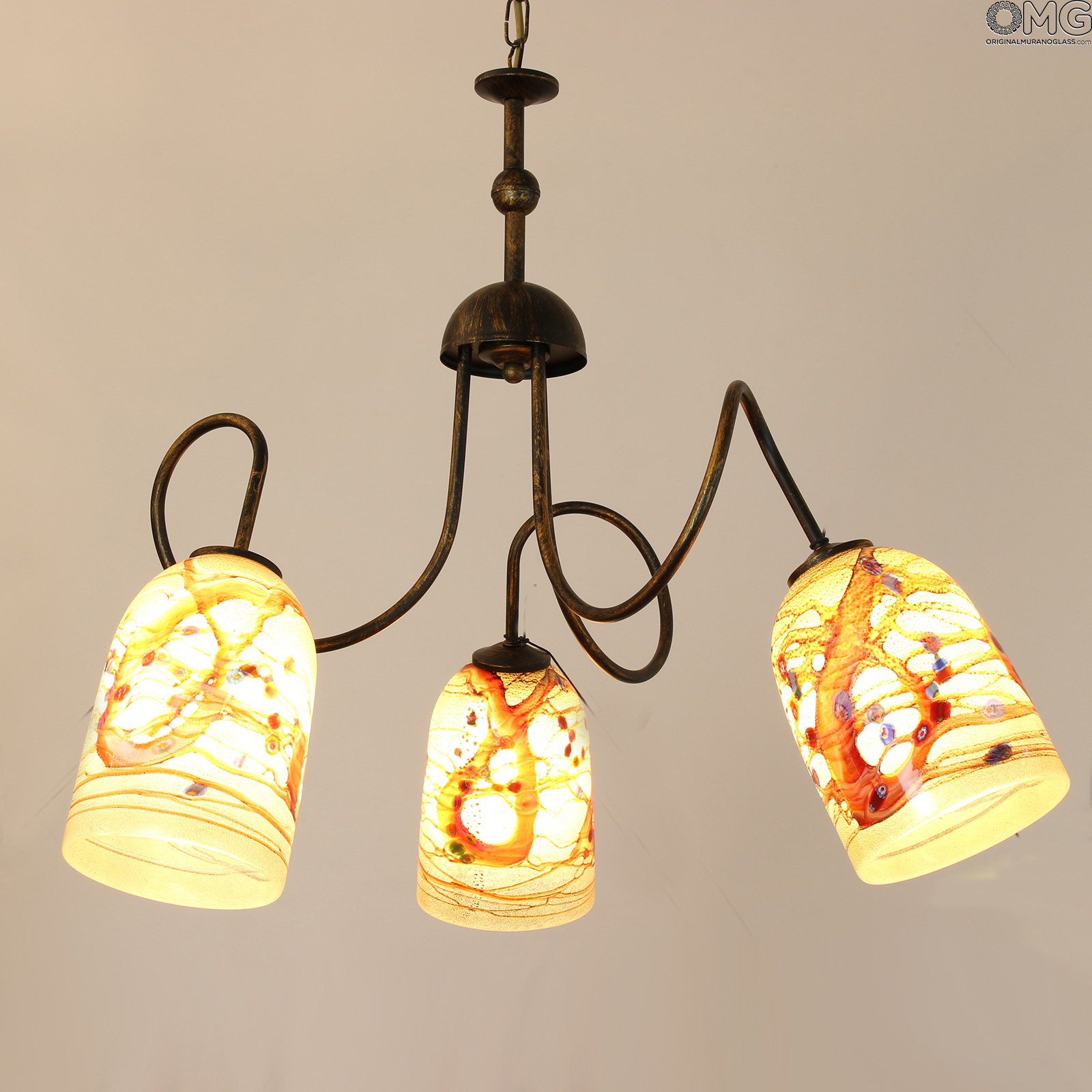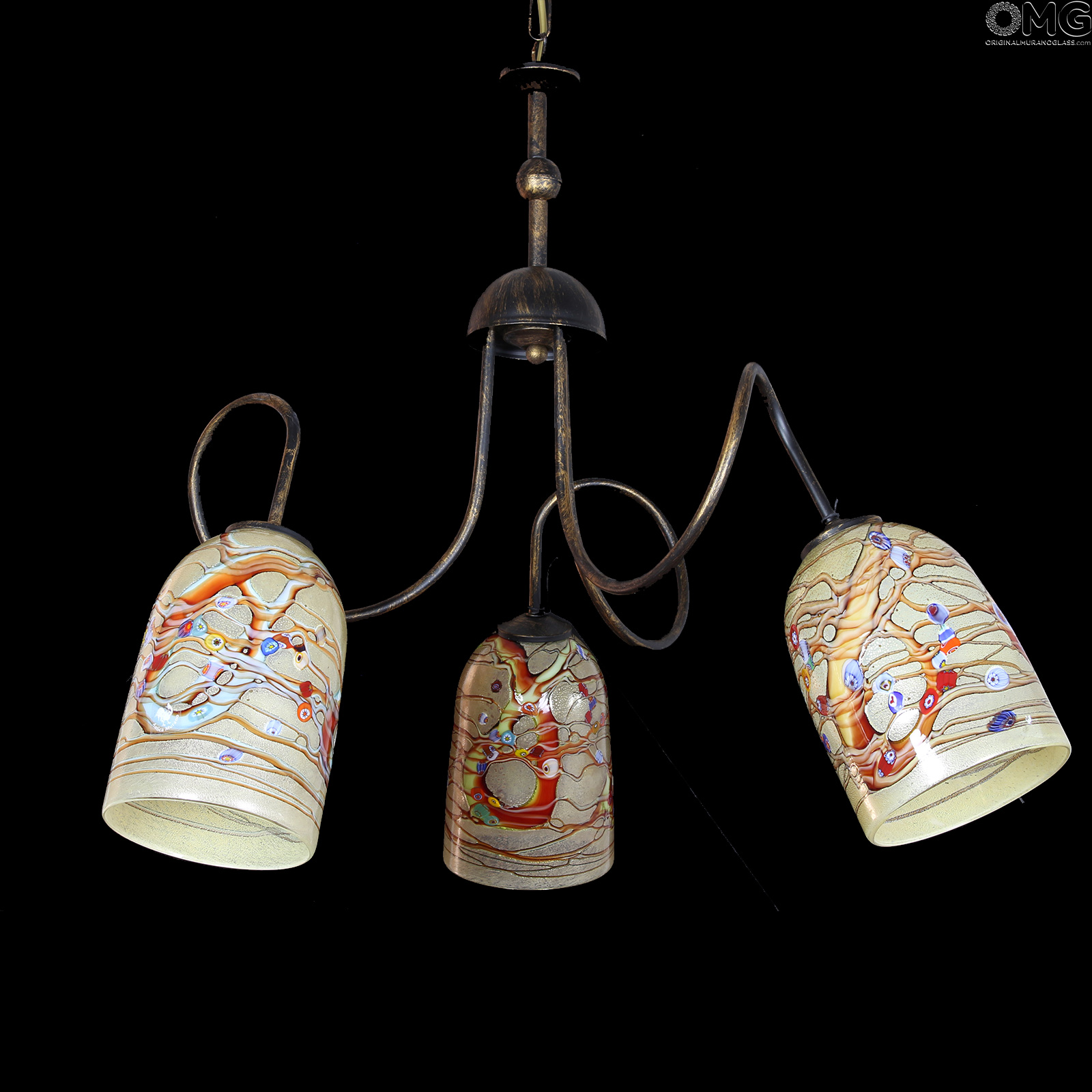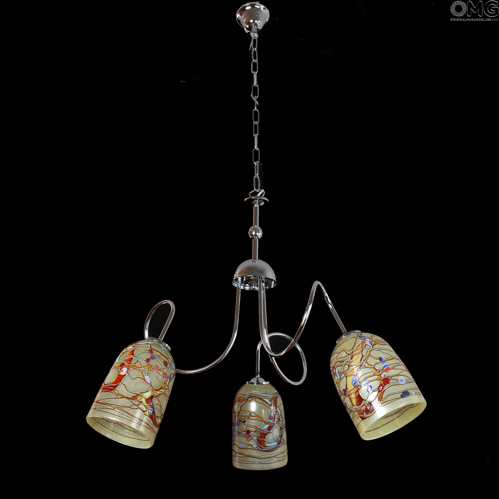 Bellissima lampada in vetro soffiato con decori in canna e mille fiori. Lampadario in vetro di Murano originale OMG a 3 luci, con tazze portalampada in vetro artistico con murrine millefiori, canne ambrate e argento. La montatura è cromo.