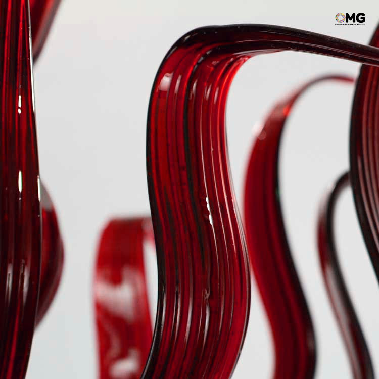 Lampadario veneziano in vetro artistico color rosso con dettagli floreali.