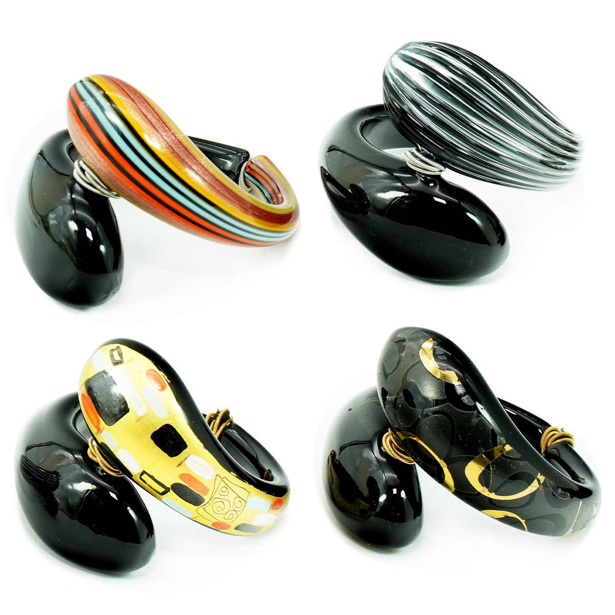 Elegante bracciale di design per gli amanti di Klimt e non solo. I gioielli sono in vetro soffiato a mano con la tecnica della lavorazione al lume. A freddo vengono invece dipinti in stile con oro 24kt e il famoso stile di Klimt. Peso molto leggero essendo in vetro soffiato e vuoto all'interno.