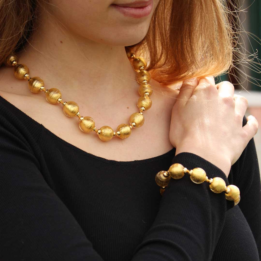 Bracciale con perle fatte a mano in Vetro di Murano lavorate a lume e impreziosite da foglia d'oro. Le perle di vetro sono fatte a mano utilizzando la tecnica del lume.