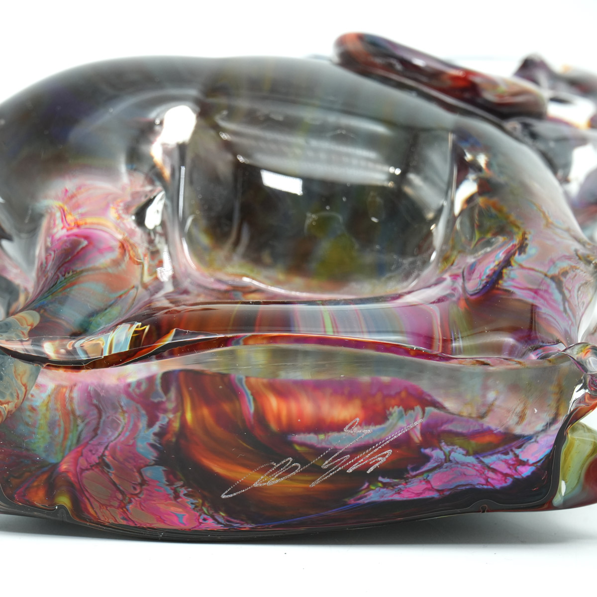 Opera d'arte esclusiva e unica di elefante, fatta a mano in vetro trasparente e calcedonio, un particolare vetro ottenuto grazie all'aggiunta di sali d'argento ed ossidi di minerali che congiuntamente all'abilità del Maestro vetraio contribuiscono a creare particolari effetti cromatici. Opera realizzata a mano libera, a puntello e in vetro massiccio.