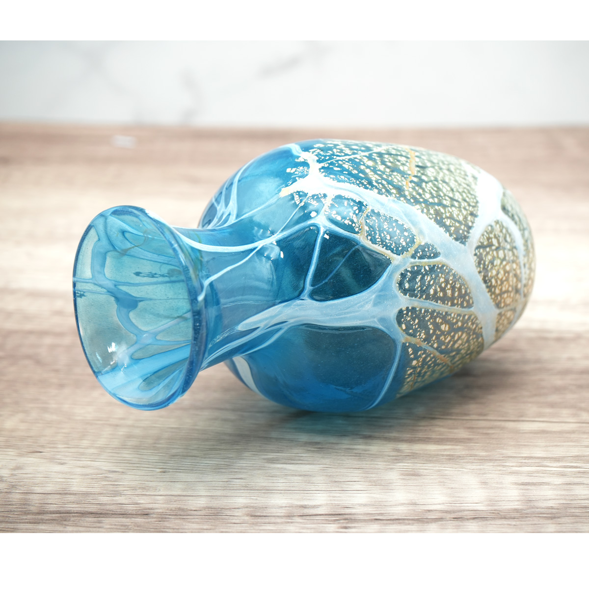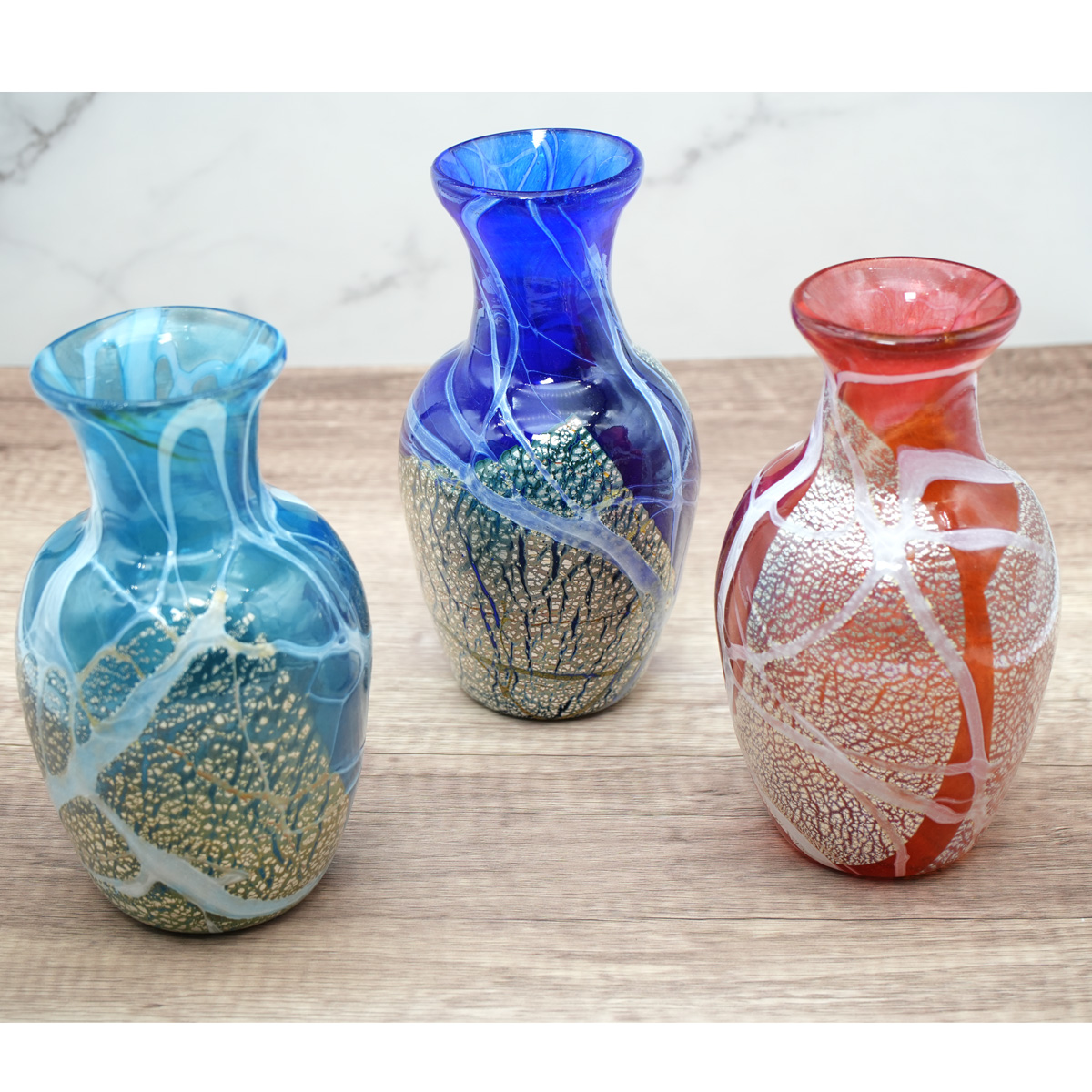 Arricchisci i tuoi spazi con questo raffinato vaso in vetro di Murano soffiato a bocca, alto 20 cm e con un diametro di 10 cm. Realizzato a mano dal maestro vetraio e decorato da vivaci intrecci di vetro colorato. Pregiate foglie d’argento creano un suggestivo effetto iridescente che cattura e riflette la luce in modo unico.