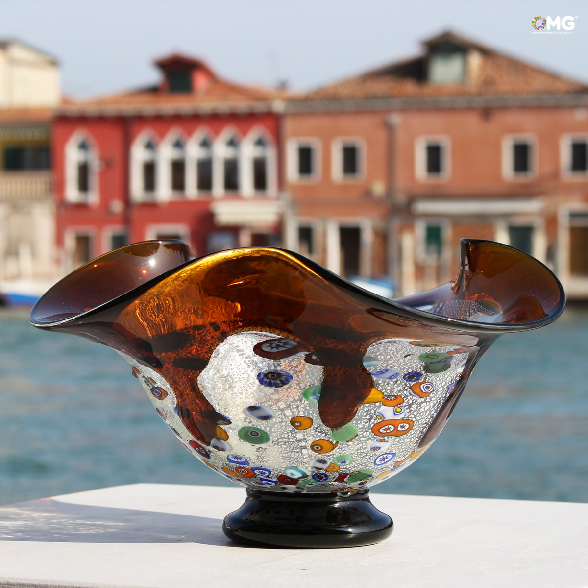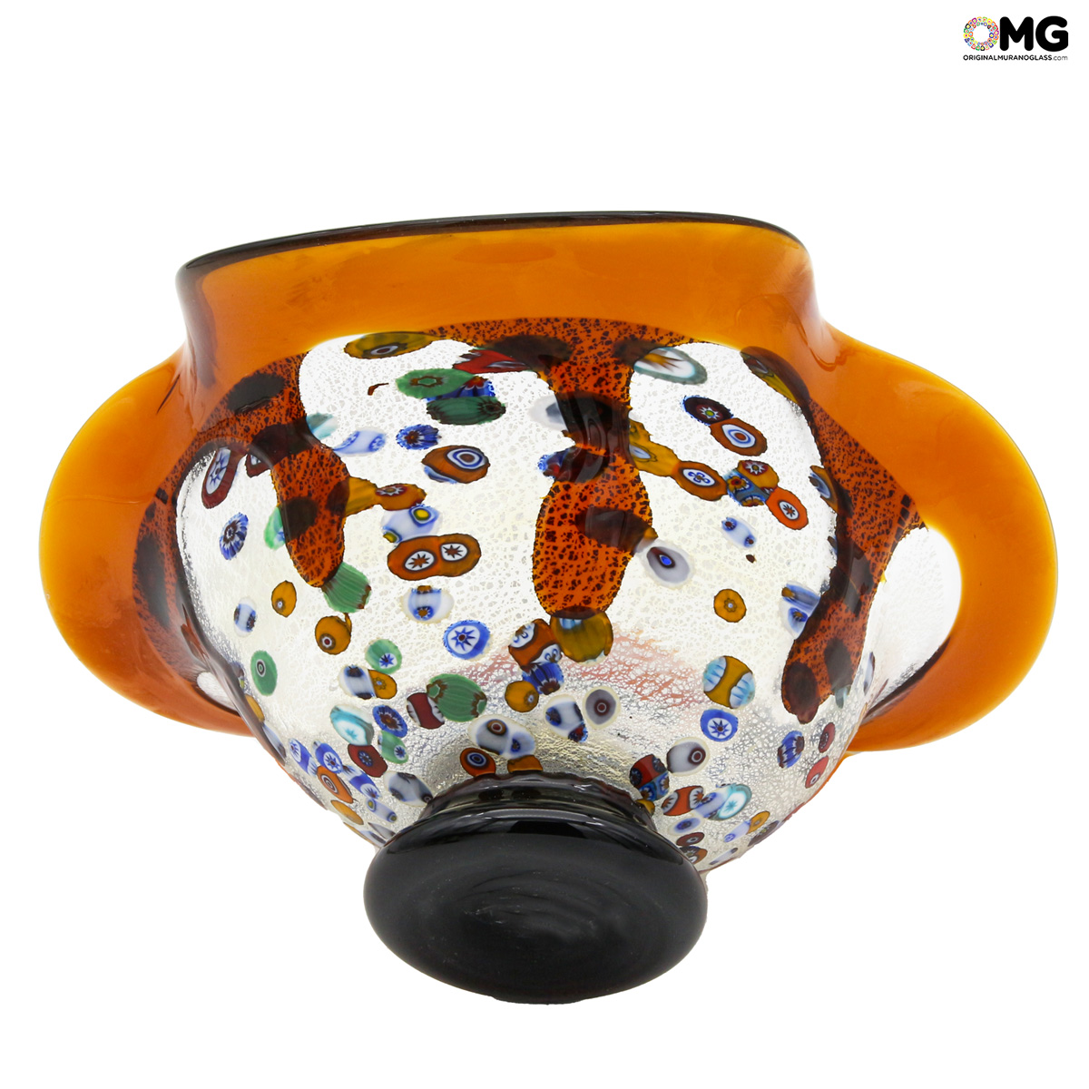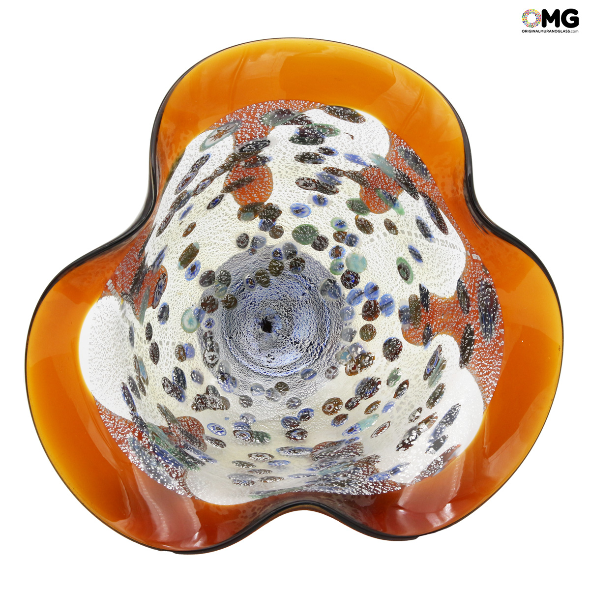 Piatto in vetro soffiato decorato con vetro ambra, murrine millefiori e argento su vetro di Murano. L'oggetto presenta la firma dell'artista realizzato con incisione a freddo. Particolare la forma ondulate del bordi. Con il marchio Vetro di Murano OMG® applicato.