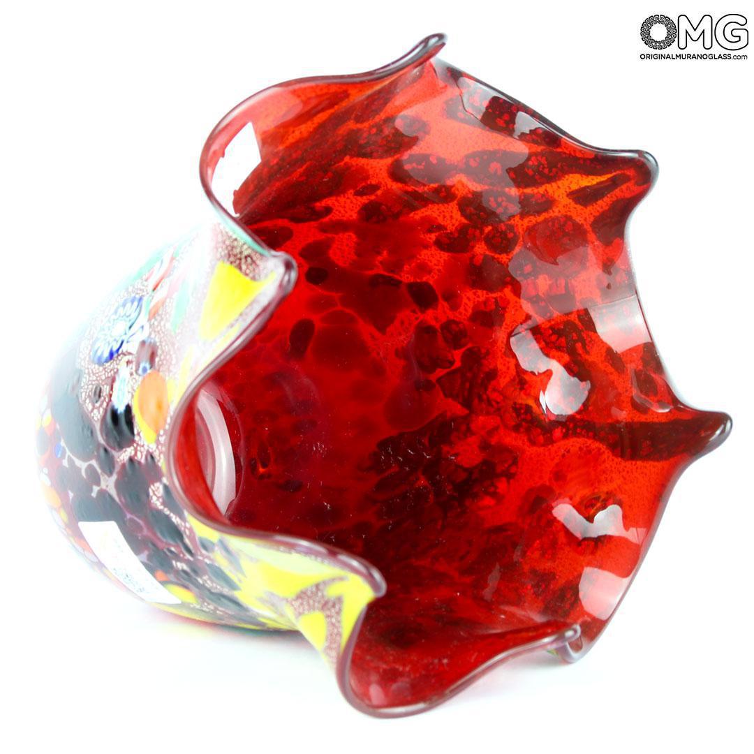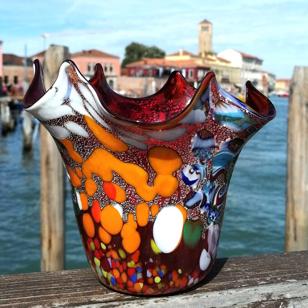 Vaso in vetro soffiato e decoro in murrina. Il vaso è firmato dal maestro Rossi con incisione a freddo.